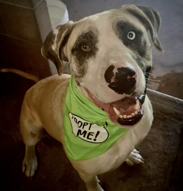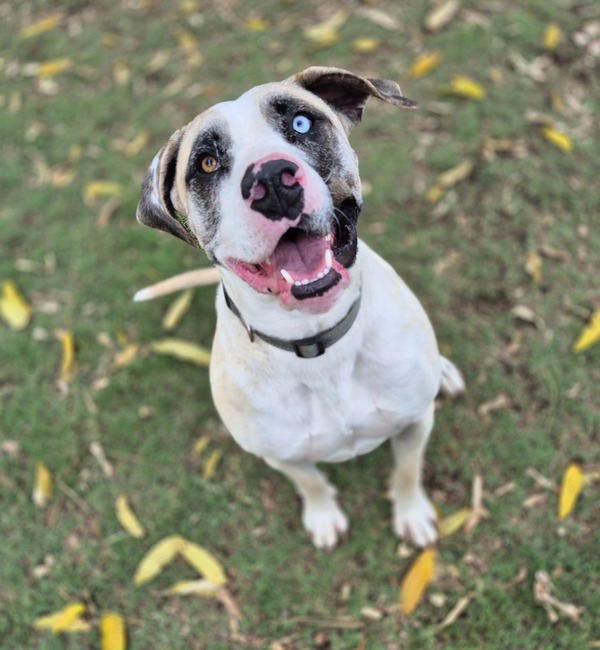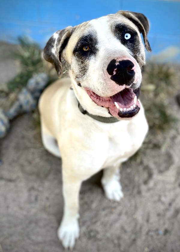Blue is a 3-year-old Catahoula-Mastiff mix whose stunning blue eye is just the beginning of his charm. Beneath his impressive appearance lies a calm, loving companion who adores his people and thrives on connection.
