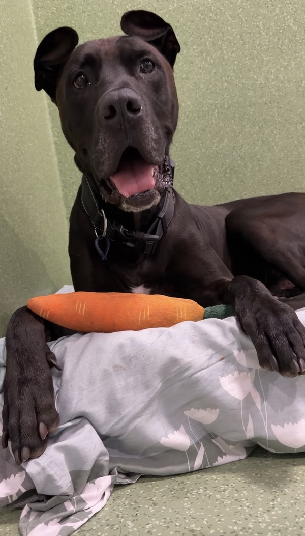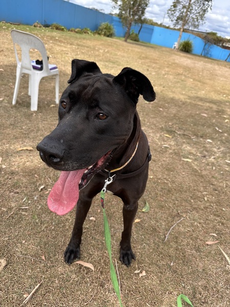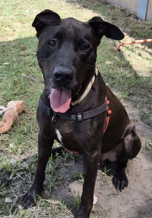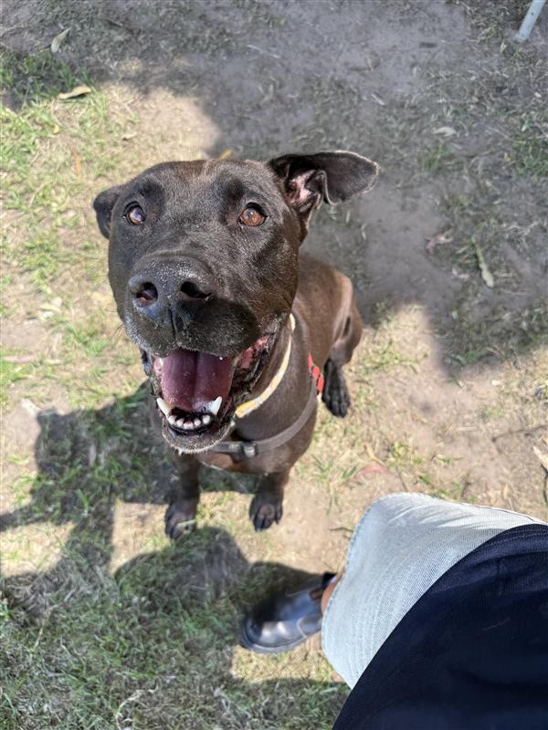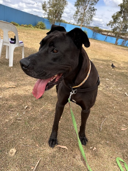 Frankie is a big, love‑soaked goofball wrapped in a mature dog body with a puppy heart. He adores being glued to his humans, leaning his whole giant self into you for affection, and - yes - trying to sneak onto your bed at night (he can settle if the bedroom door is closed!). He's also a professional couch‑hog, drool‑rag model, and enthusiastic water‑splasher. Frankie can be quite stressed and drooly when first in the home, a drool rag comes in handy for that settling in period.