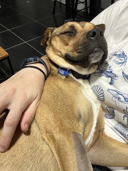 She has also been in a foster home with a cat, and has shown to be social with them even if they don't quite understand her play bows. She is open to a home with a feline friend as long as adopters are willing to allow a slow introduction.
