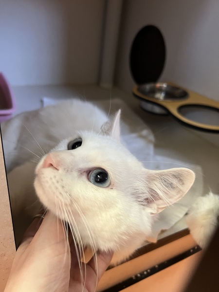 Because he can become overwhelmed in large, open spaces, Marshmallow should start off in a small launch room where he can feel safe and settle at his own pace before exploring the rest of the house. His perfect home will offer plenty of cozy hiding spots-like cardboard boxes, cat igloos, or soft beds-as well as scratch posts, cat trees, and access to high and low perches where he can watch the world go by.