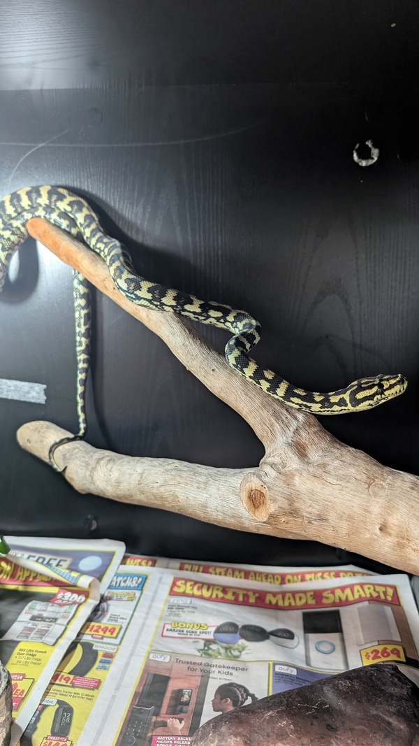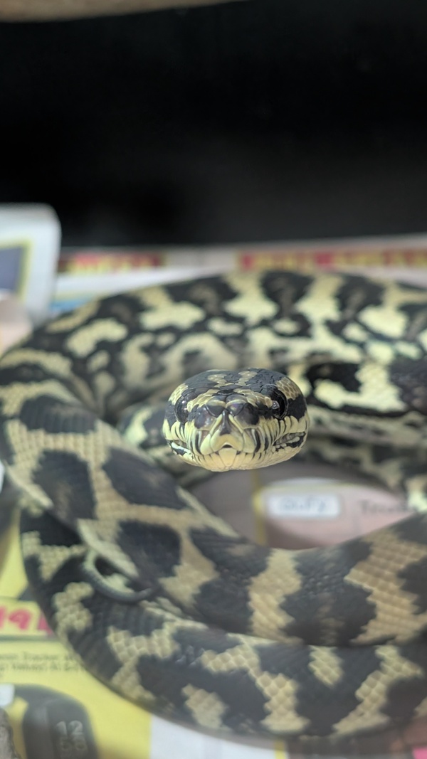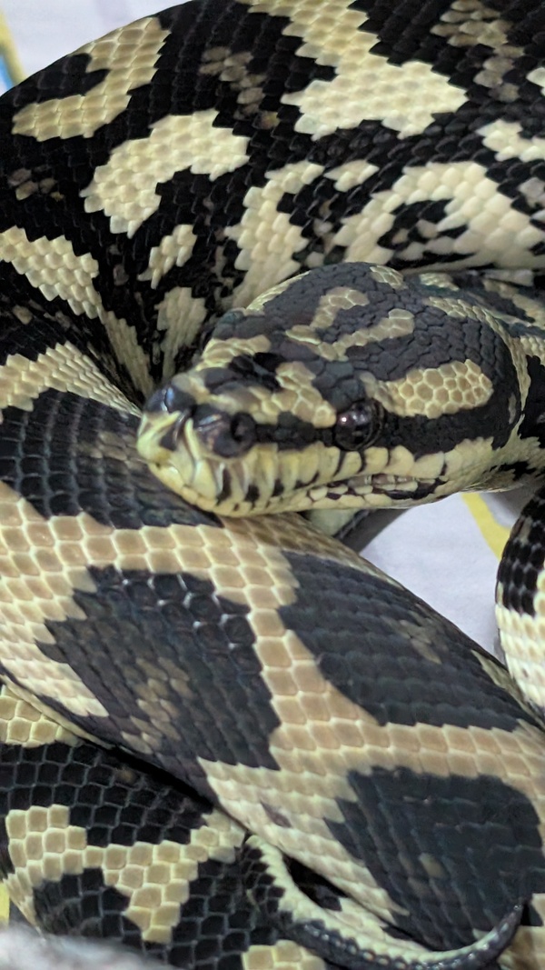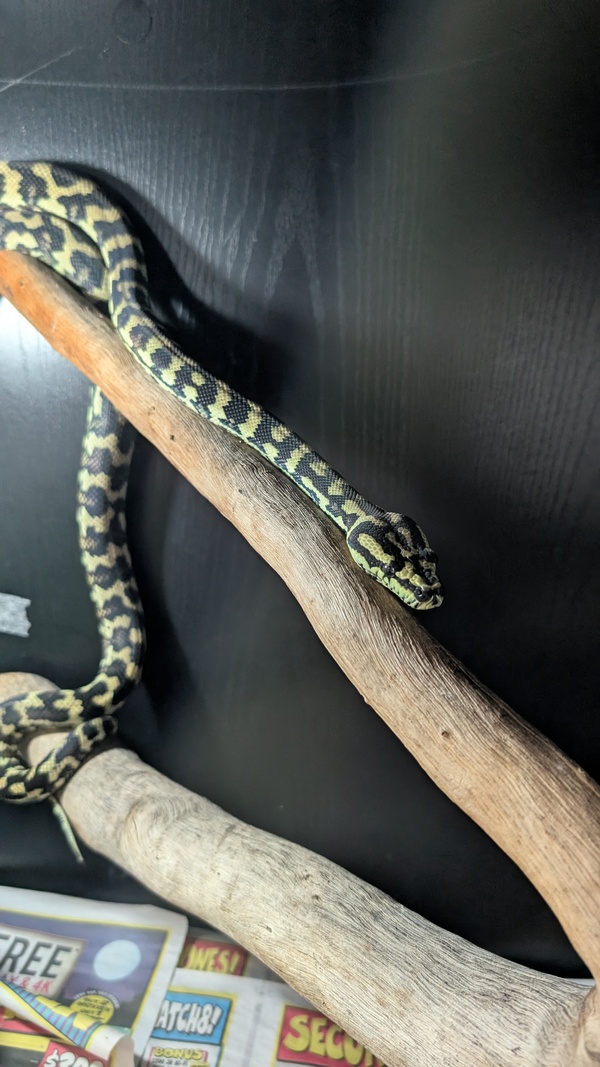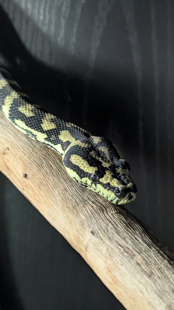 Hi, my name is Banana and I'm a Jungle Carpet Python. You would usually find my species in the tropical rainforests of Queensland.