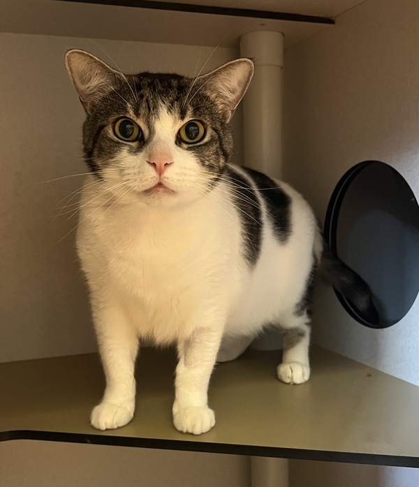 To help Bug feel secure, their home should include a variety of safe spaces-scratch posts, cat trees, cozy hides like cardboard boxes or igloos, and access to shelves or dressers. Having both high and low spots available will allow Bug to choose where they feel most comfortable as they adjust.