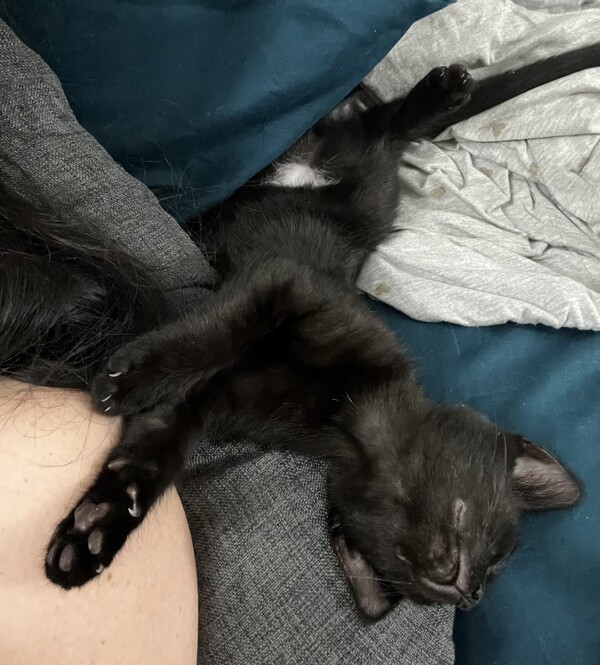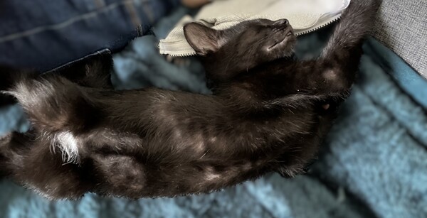 I'm a handsome boy with a unique white patch on my underside-my own tiny secret spot that makes me one of a kind! When I'm not zooming around the room or batting at toys, I absolutely love cuddles. My favourite thing ever? Being tucked into long hair like a little cozy nest. If you have long hair, I'll gently burrow into it when I'm ready for snuggles... it's like my own personal kitten blanket.