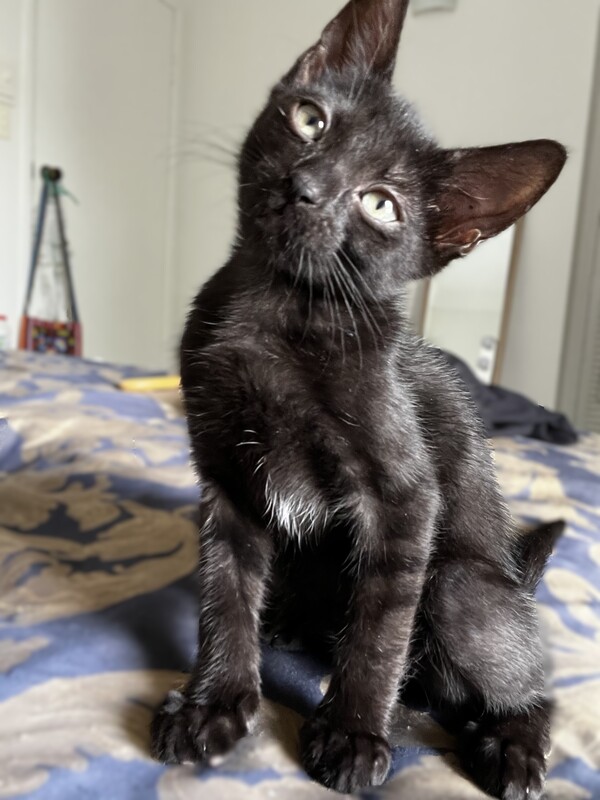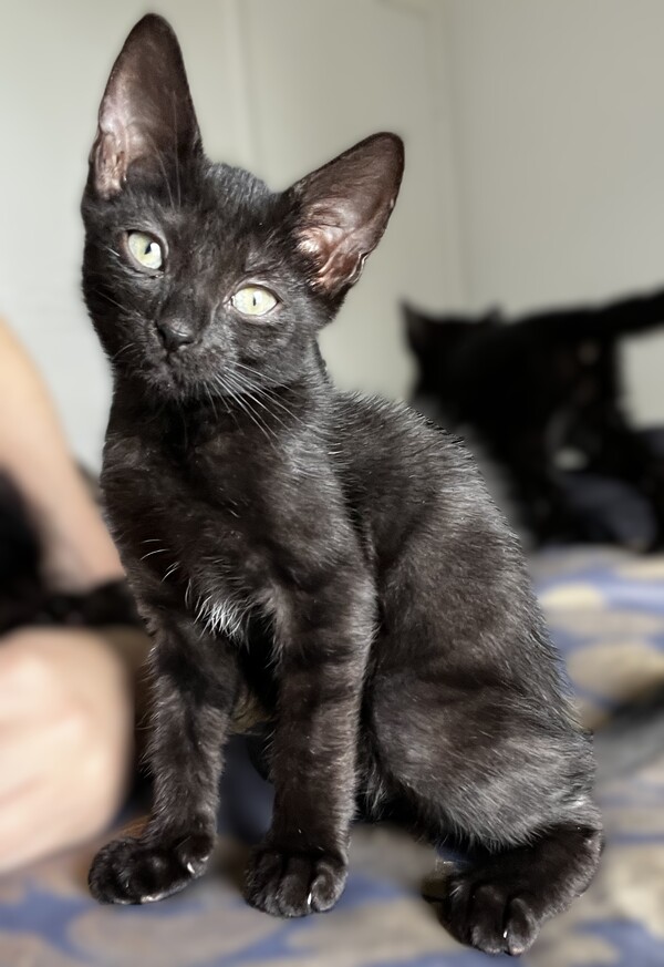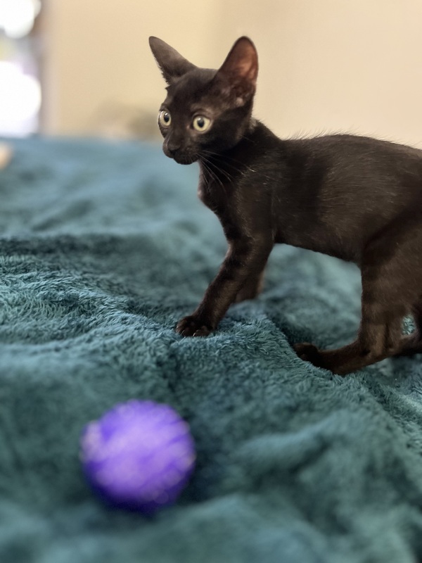and I'm the little black whirlwind you've been waiting to meet! I'm a sleek all‑black girl with endless energy-I play hard, run fast, and can turn just about anything into a toy. If you're looking for a kitten who brings life, laughter, and a whole lot of zoomies into your home, I'm your girl.