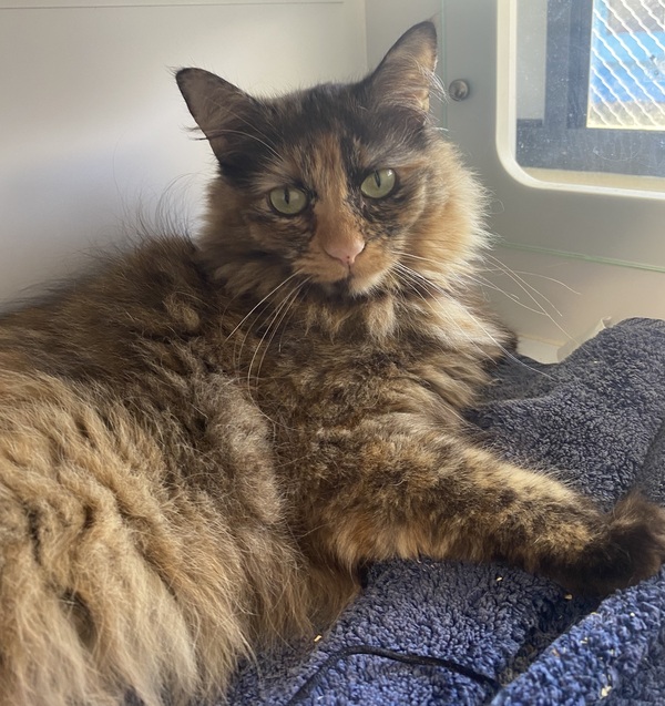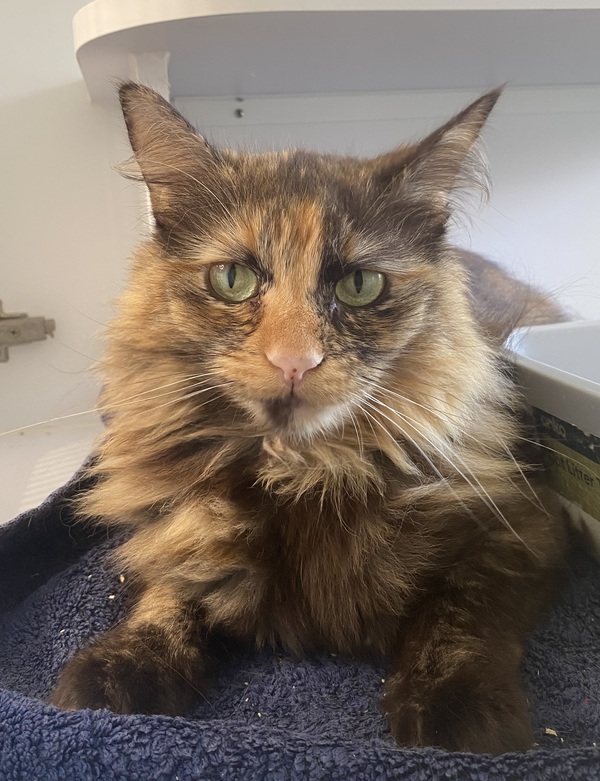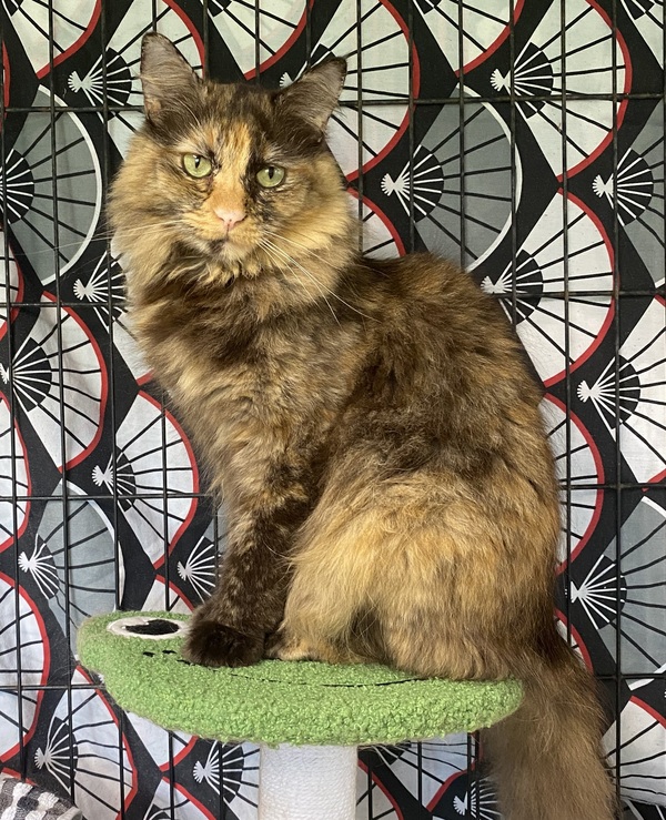 Gwen is a stunning Chocolate Torti with a big, sassy personality that will keep you entertained every day. She's confident, independent, and knows exactly what she wants-preferably four paws on the ground rather than being carried around.