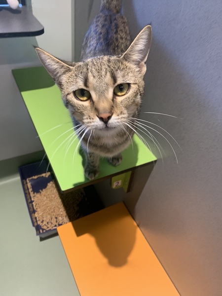 This lovely lady lives for mealtimes - she enjoys her food with impressive enthusiasm - and once she's full and content, she'll often come over to softly ask for pats. Cleo loves affection, but only when she chooses the moment, and she prefers to keep all four paws on the ground.