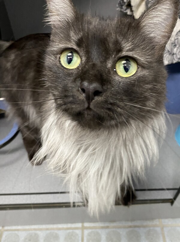 Aldi is a stunning female cat with a luxurious, fluffy smoke and grey coat that's just as soft as it looks. Her elegant appearance is matched by her gentle, sweet nature, making her a delight to have around.