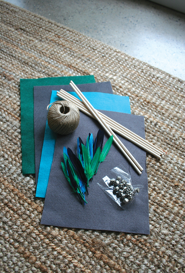 - Thread three bells onto the end of a long piece of twine and tie and knot the twine tightly